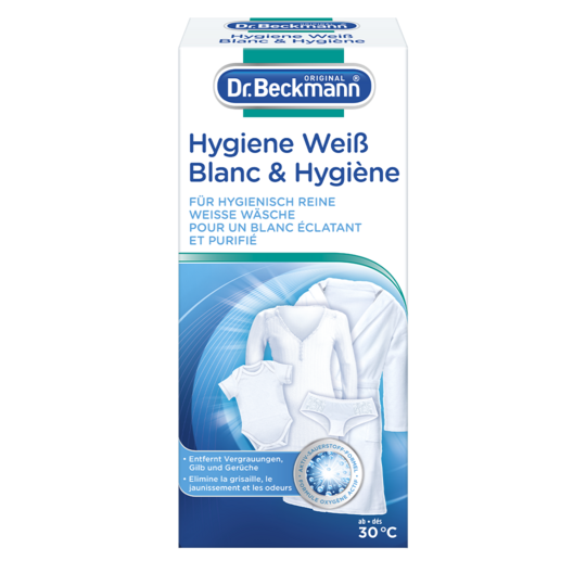 Dr. Beckmann Hygiene Weiß verbindet die wichtigen Faktoren Hygiene und Weißkraft miteinander. So wird die Wäsche bereits bei niedrigen Temperaturen hygienisch sauber und strahlend weiß.